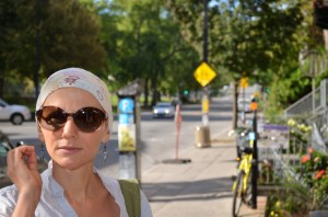 It actually felt really, really nice to feel the breeze on my skin, where I’d never felt it before. I enjoyed being at home with a bald head. I couldn’t ever quite get the courage to go bald in public though, so I acquired a set of head scarves. I still looked like a chemo patient, but had some fun scarves to wear that looked less dramatic, and became accessories to what I wore. I still worked outside a lot, so I had my gardening/work head scarves that could get dirty and be part of my work attire, and then some nicer ones.