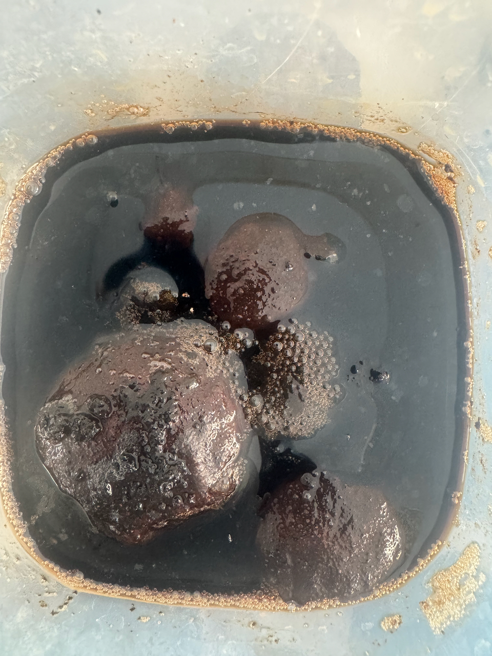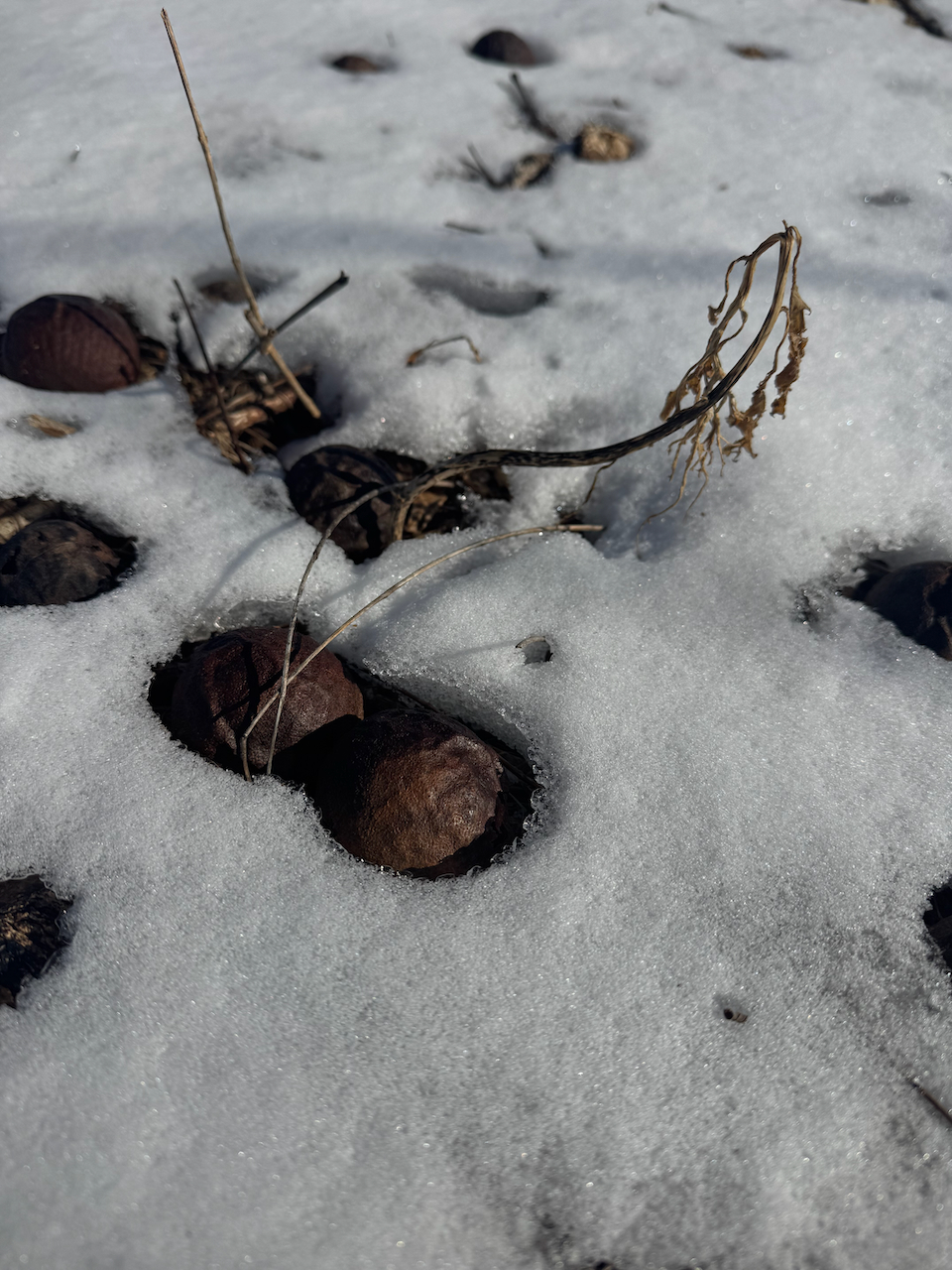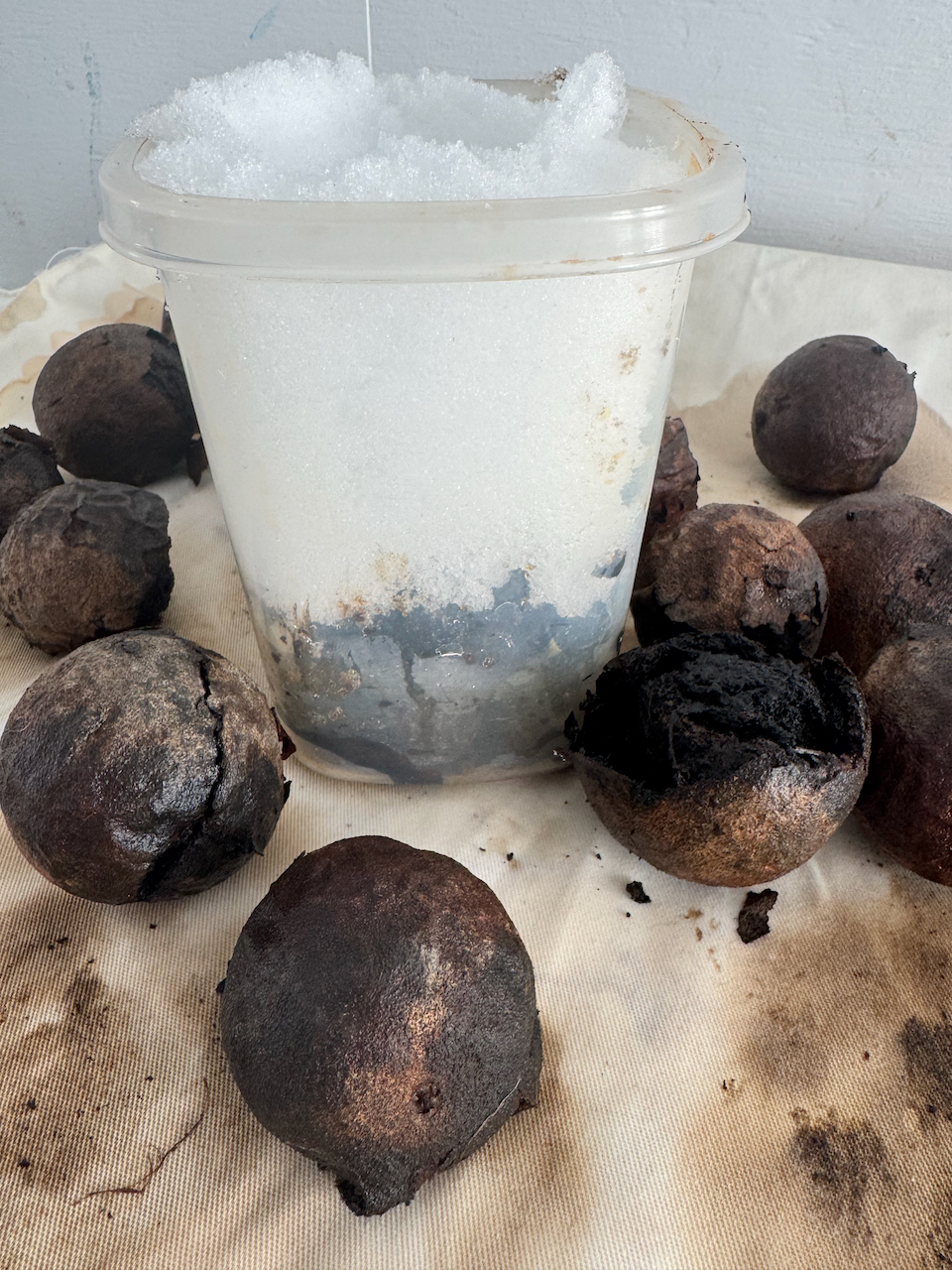 I found some in the snow, decomposing. Yay! I gathered a few, washed them off, and then let them soak in snow for several days in the studio. One had some dead little grubs inside, so I accidentally took some winter bird food away from the critters. Although I wonder what they taste like, soaked in that intense tannic juglone chemical that keeps many other plants from growing nearby.