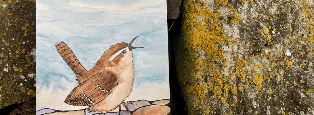 The iconic rock walls covered with lichens and mosses are familiar here, as are the familiar Carolina Wrens that belt out their tunes. Little Wren’s browns were created using Black Walnut’s Ink (the dark brown on his back), and brownish hues of Narrow-leaf plantain and yellow onion skins mixed to make his brownish belly. The rocks that are brown are various invasive plants from around here that I acquired during a workshop I attended.