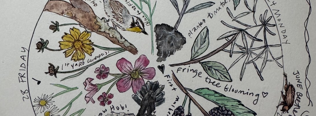 I took a previous online offering with Janisse, and it inspired me to begin creating phenology wheels. For me, they’ve become a perfect way to gather and reflect on my observations—what’s happening, when it’s happening and how it’s all woven together, what I see both in the natural world and in my garden. They give me space to practice sketching and painting skills, while sharpening my ability to notice patterns and seasonal change.