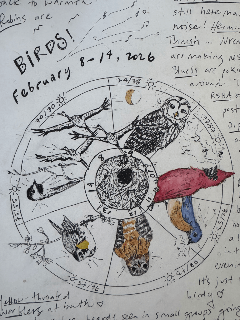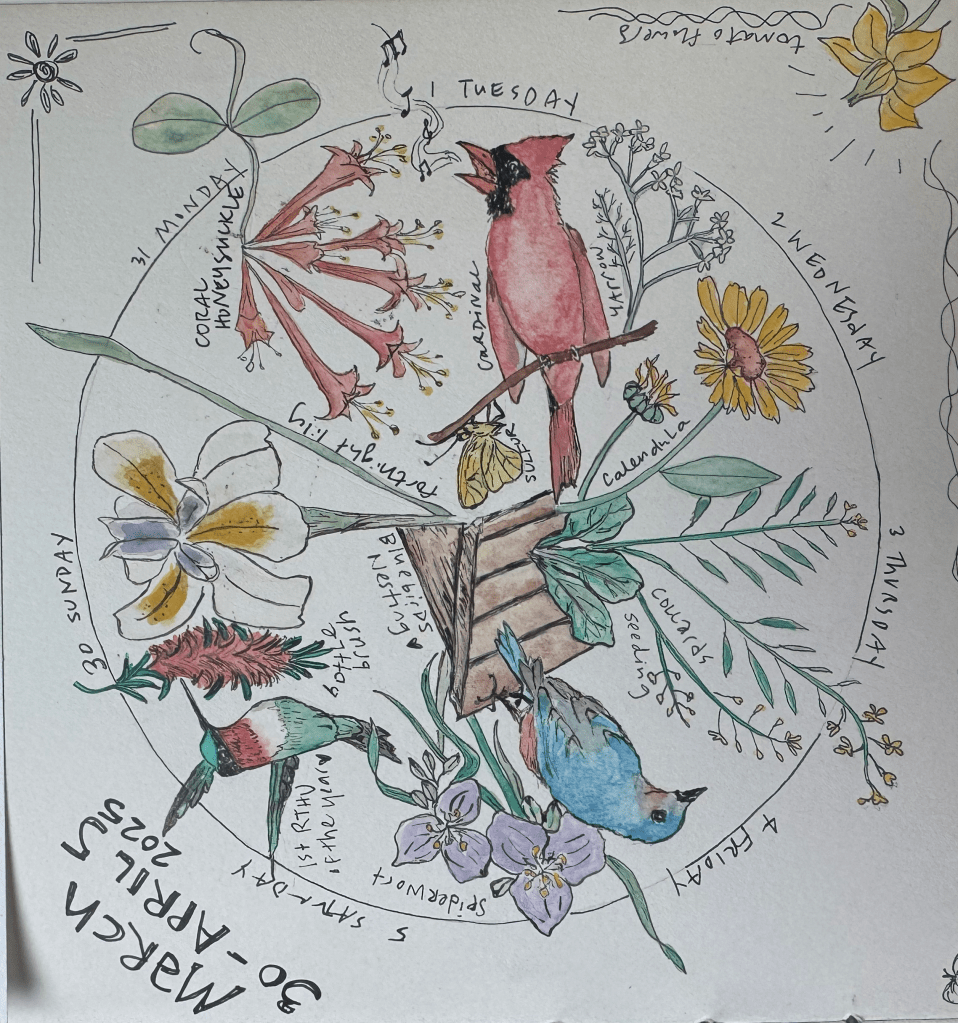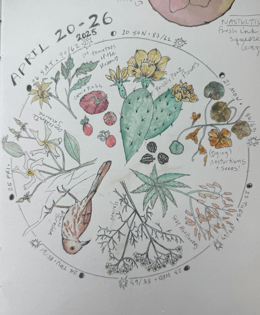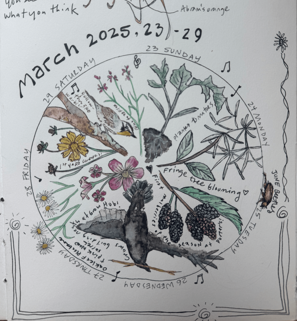 Phenology: the study of the timing and cyclical patterns of events in the natural world, particularly those related to the annual life cycles of plants, animals, and other living beings. I love making wheels to capture some of the weekly, monthly, or seasonal goings on in the natural world.